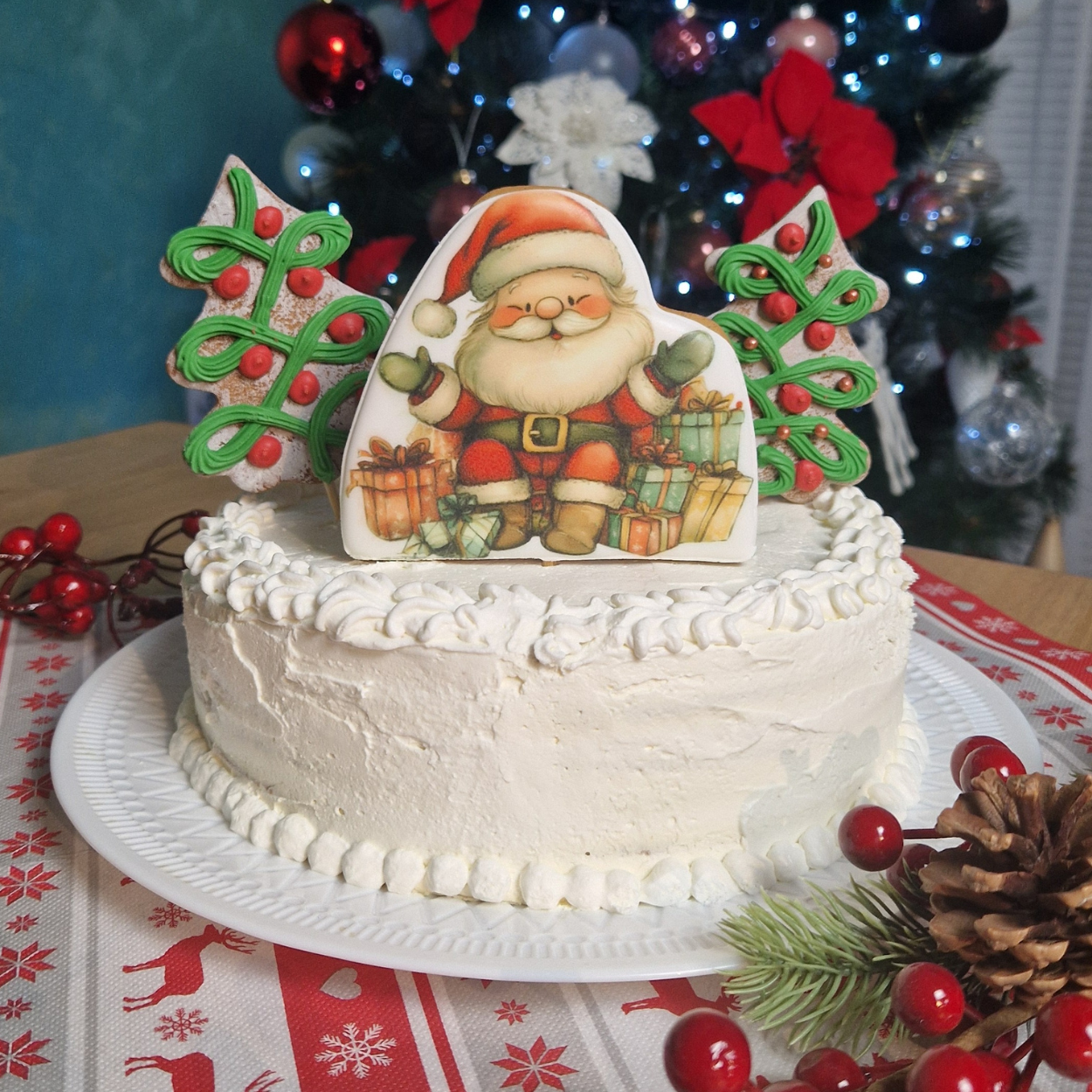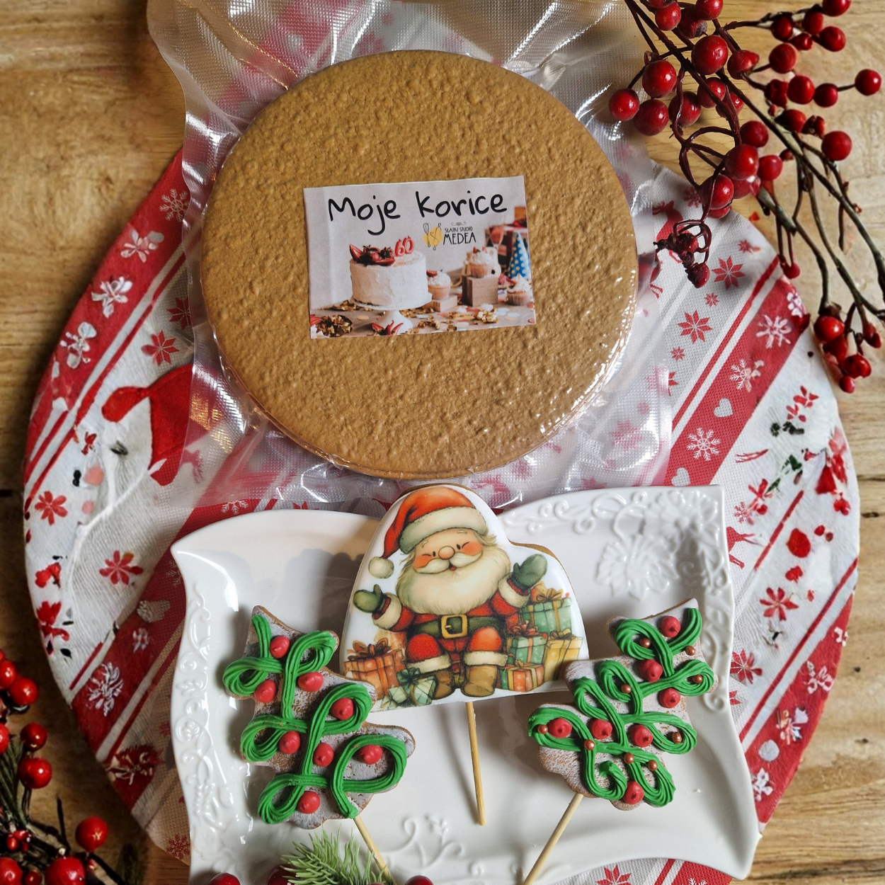 Komplet za novogodisnju tortu sadrži 1 pakovanje korica za medovik i 3 jestiva topera (ukrasa) za tortu.